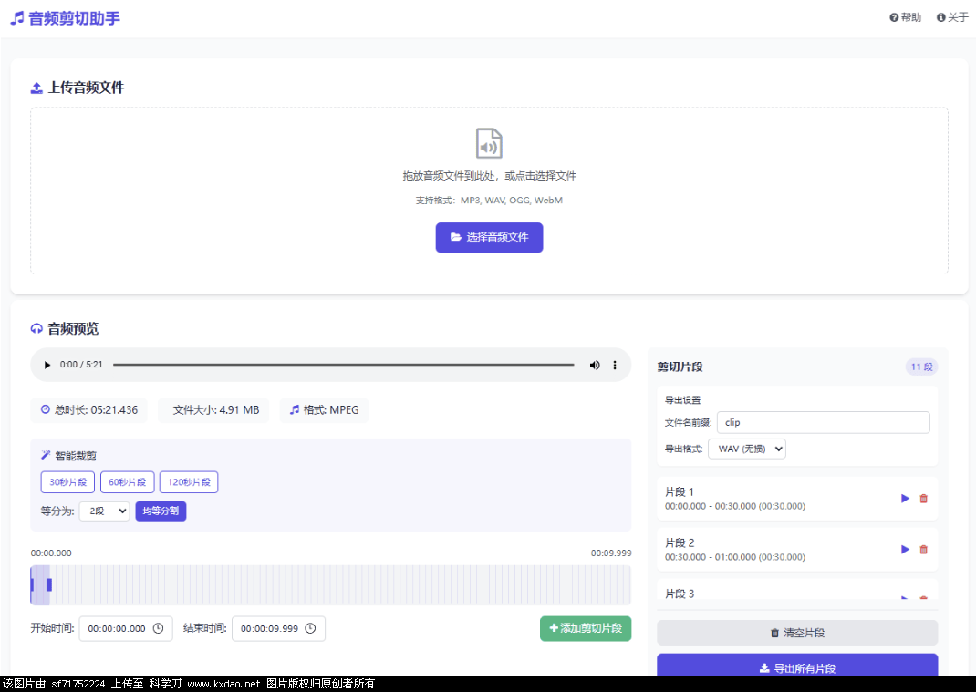 5. 导出片段设置完所有需要的剪切片段后,可选择导出格式(WAV无损或MP3压缩),点击"导出所有片段"按钮下载所有片段。