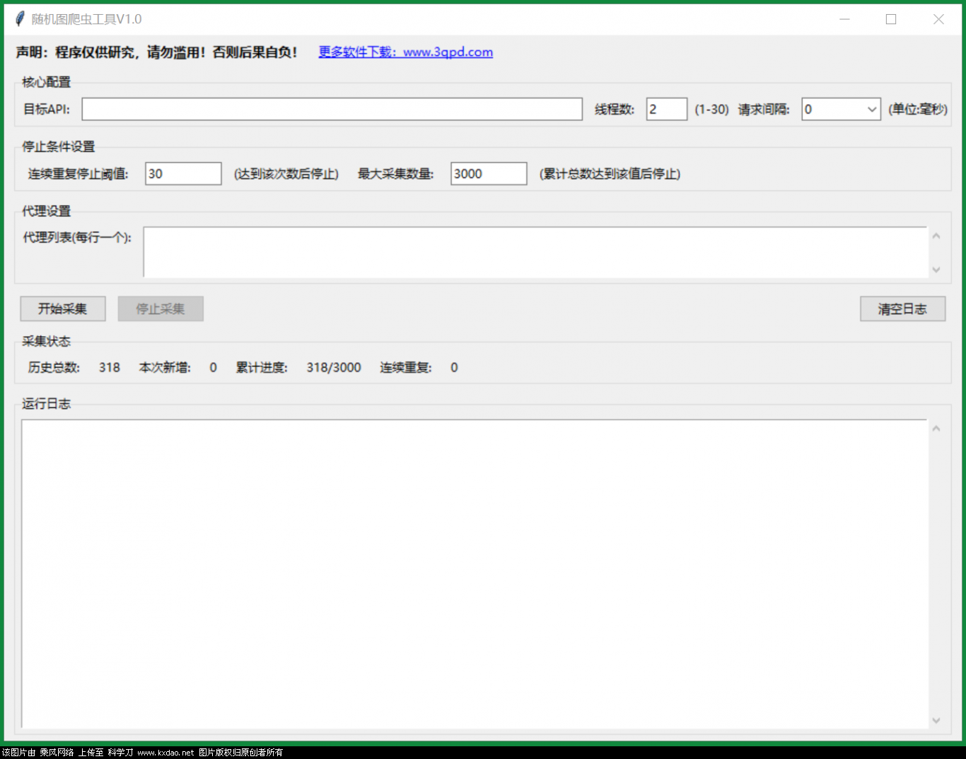 功能简介:默认去重爬取,历史记录可以存档,支持线程数、请求间隔、代[过滤]理设置、停止条件设置,采集状态以及运行日志。