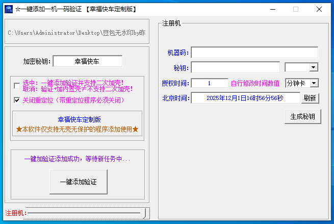 一键双效防护:快速给程序添加秘钥+一机一码验证,防止非法传播。