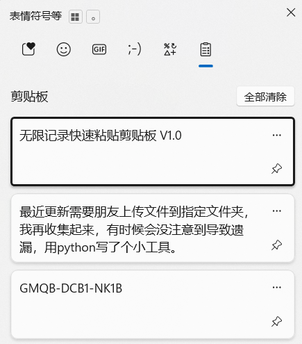 1.跟系统剪贴板差不多,按下Win+V后弹出剪贴板,剪贴板失去焦点则会隐藏;复制内容时会将其放到剪贴板上(自动去重),目前可以识别文本、图片、文件这三种类型