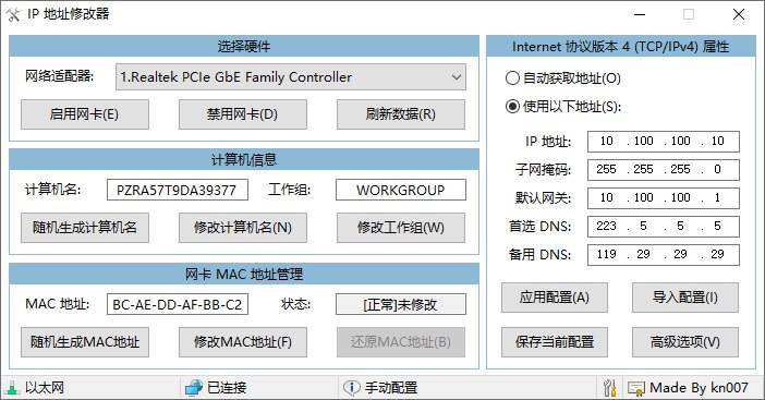 IP 地址修改器是由 kn007 大佬编写的一个小工具,如其名,可以方便的进行IP地址,网卡MAC等修改,支持多网卡,并且支持管理导入多份配置,同类工具中的翘楚。